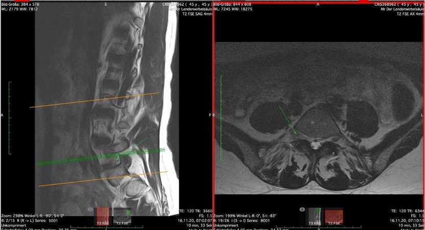 Пациентка уже 10 дней страдала правосторонним ишиасом, который кроме боли в ногах проявлялся еще и онемением и потерей чувствительности в левой нижней конечности. Во время неврологического обследования правая часть её левой ступни показывала неестественное смещение. МРТ показала крупную экстрафораминальную грыжу диска в сегменте L5/S1, которая давила на нервный корешок L5.